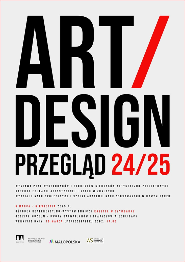 Wstęp: Wystawa Art/Design - przegląd 24/25 prezentuje prace wykładowców katedry Edukacji artystycznej i sztuk wizualnych oraz prace studentów kierunków artystyczno-projektowych: Graphic design i technologie wizualne (studia pierwszego stopnia) i Projektowanie zorientowane na użytkownika nowych mediów (studia drugiego stopnia), Wydziału Nauk Społecznych i Sztuki, Akademii Nauk Stosowanych w Nowym Sączu.