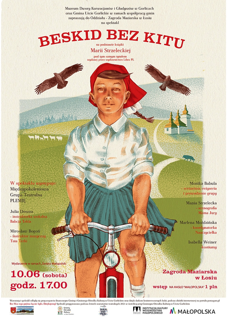 „Beskid bez kitu” to najpierw fascynująca książka Mani Strzeleckiej zakochanej w Beskidzie Niskim. Lata 60- te, mała pegeerowska wioska, bohaterką jest dziewczynka Terka, która spędza wakacje u „przyszywanej” babci Tekli, Łemkini, która ma dla niej dużo czasu i wiele opowieści. Poznajemy trudne losy babci i jej narodu, który musiał opuścić swoją ziemię w 1947 roku podczas Akcji Wisła. Uczymy się od niej rytuałów, właściwości ziół i pieśni łemkowskich. Książka stała się niezwykłą inspiracją do pracy teatralnej. W samym sercu Beskidu Niskiego powstała grupa teatralna „Plemię”, której główną ideą jest opowiadanie historii tej ziemi. W naturalnym plenerze, w zagrodzie łemkowskiej z widokiem na cerkiew, z muzyką na żywo słuchamy historii babci, śledzimy przygody wnuczki i doświadczamy magii Beskidu Niskiego.