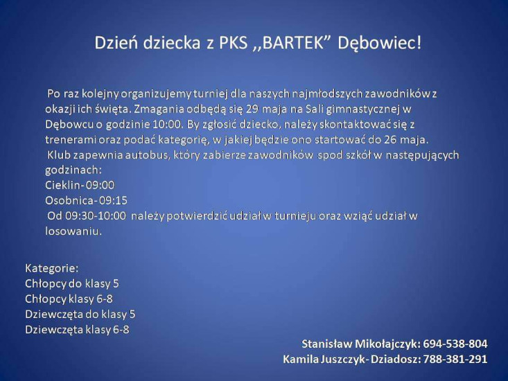 Trenerzy klubu sportowego „PKS Bartek” Dębowiec zapraszają na turniej dla najmłodszych zawodników z okazji ich święta.