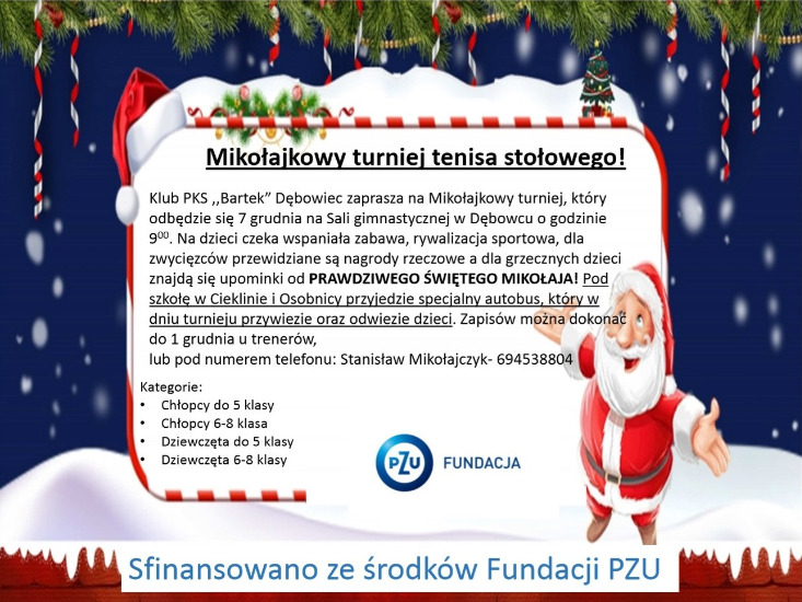 Klub PKS ,,Bartek” Dębowiec zaprasza na Mikołajkowy turniej, który odbędzie się 7 grudnia na Sali gimnastycznej w Dębowcu o godzinie 9:00.