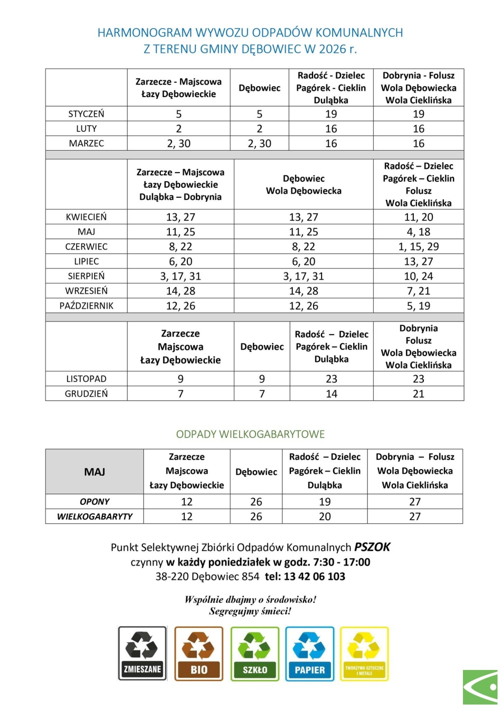 Harmonogram wywozu odpadów komunalnych z terenu Gminy Dębowiec na 2026 r.