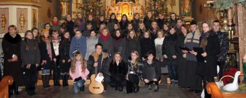 Uczestnicy koncertu wysłuchali wiązanki kolęd „O gwiazdo Betlejemska” i „ Oj, maluśki” w wykonaniu duetu Moniki Wcisło (saksofon) oraz Agnieszki Bal (klarnet). Następnie chór wykonał w dwugłosie kolędę „Przybieżeli do Betlejem”. Kolejne utwory w wykonaniu chóru i solistów to: „Ding dong” - Sylwia Stachurska, „Kolęda dla nieobecnych” - Magda Witusik, „Całą noc padał śnieg” - Zuzanna Walaszczyk, Monika Wcisło, „Lulaj ,że”- Sylwia Stachurska, „Skrzypi wóz” - cały chór a także „Feliz navidad”- Justyna Podulka, Karolina Kurdziel, Patrycja Dykas.